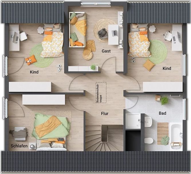 Auch das Obergeschoss besticht durch Großzügigkeit. Neben einem gemütlichen Schlafzimmer haben Sie dort zwei Kinder- und ein Gästezimmer, also genügend Platz, um sich zu entfalten.