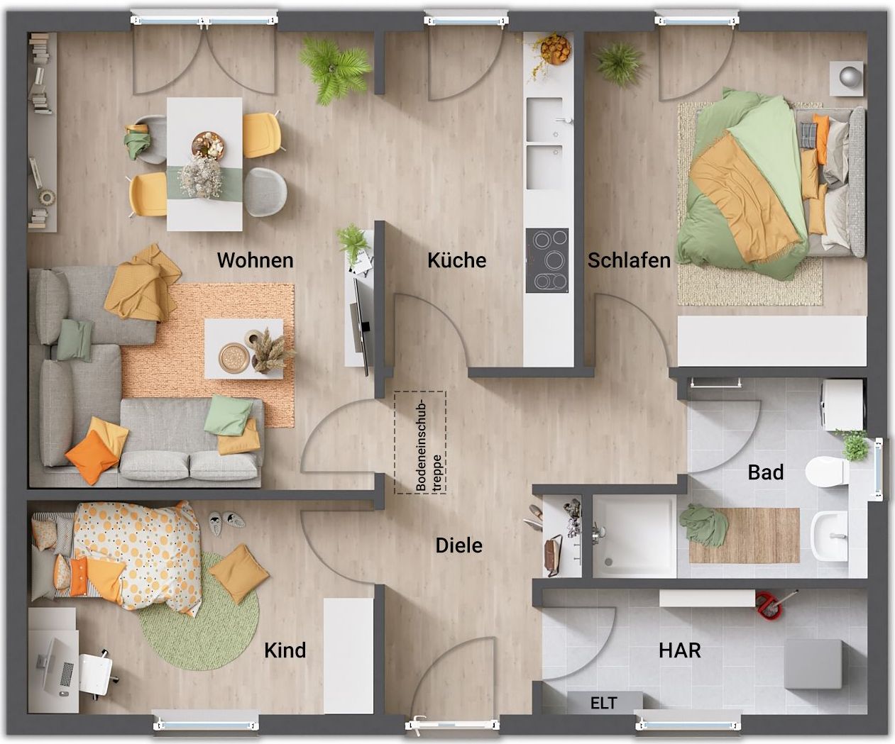 Auf rund 78 Quadratmetern finden Sie dank cleverer Planung ausreichend Platz für die ganze Familie. In den hellen, großzügig geschnittenen Zimmern wohnen Sie auf einer Ebene mit der Natur. Ob Wohnzimmer, Küche oder Schlafzimmer – überall sind Sie nur einen Schritt von Ihrem Garten entfernt. Alles ist übersichtlich und mühelos erreichbar. So können Sie Ihr Leben ohne großes „Auf und Ab“ genießen.
