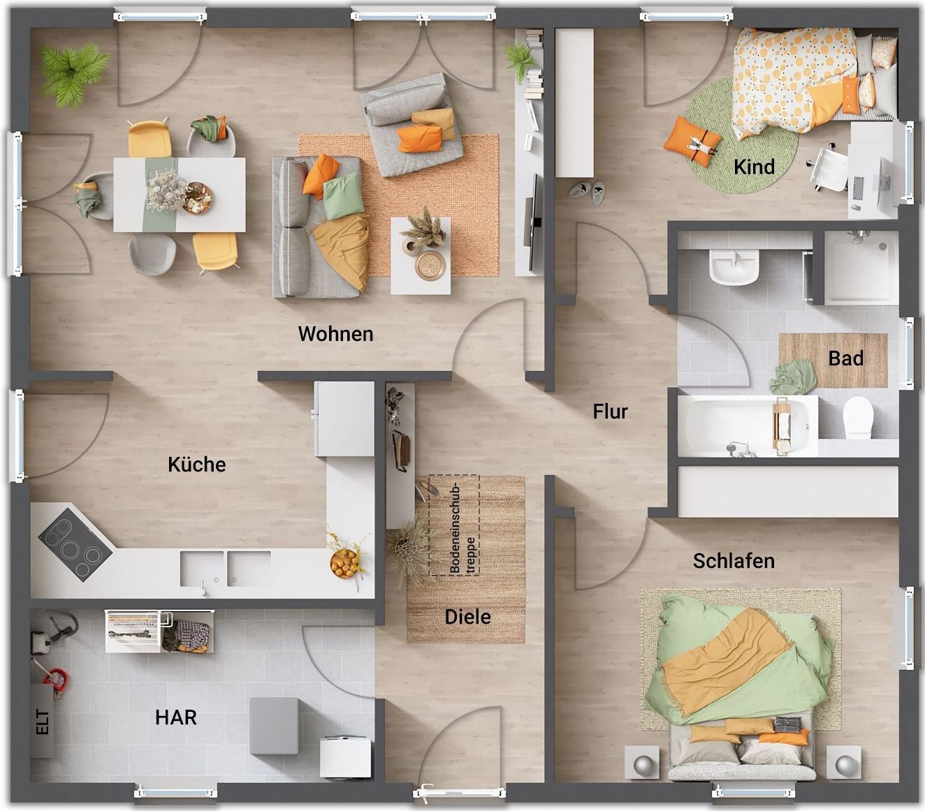 Das geräumige Wohnzimmer ist Treffpunkt für die ganze Familie. Durch die großen Fenster können Sie direkt in Ihren Garten blicken und das einfallende Tageslicht genießen. Auch das Schlaf- und Kinderzimmer haben die richtigen Wohlfühlmaße und bieten jedem Familienmitglied seinen persönlichen Rückzugsort. Im Bungalow 92 genießen Sie ein ungezwungenes Wohnen ohne Hindernisse.
