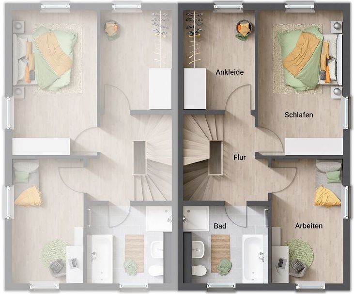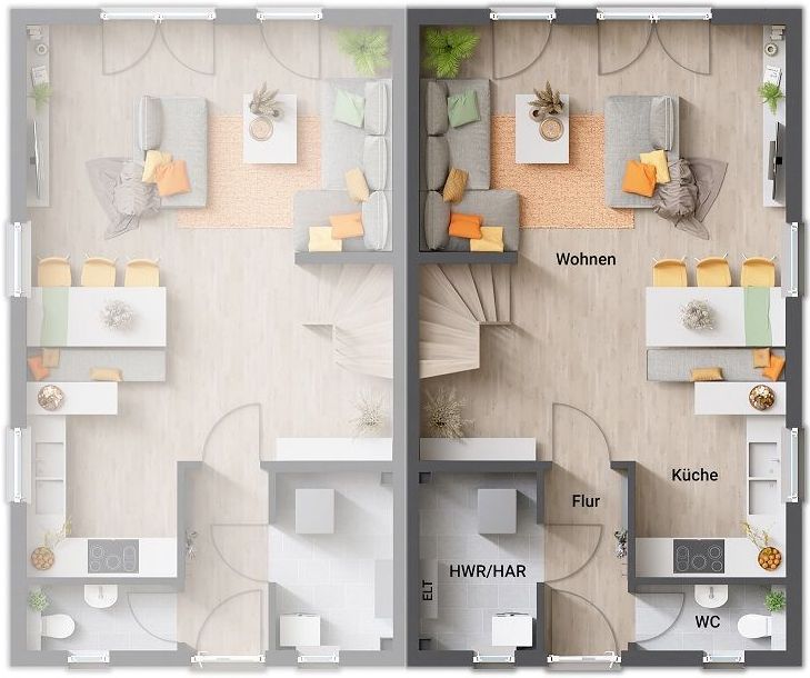 Eine Doppelhaushälfte bietet Ihnen die Vorteile eines normalen Einfamilienhauses, benötigt aber weniger Grundstücksfläche. Die effiziente Raumaufteilung des Doppelhaus Mainz tut ihr Übriges dazu: Im Erdgeschoss erstreckt sich das geräumige Wohnzimmer mit genügend Platz für Entspannung und Familienaktivitäten. Mit einem schönen Esstisch machen Sie das Wohnzimmer zum zentralen Treffpunkt mit Ihren Lieben. Die bodentiefen Fenster verwöhnen Sie mit angenehmen Tageslicht und einem Blick ins Grüne.
