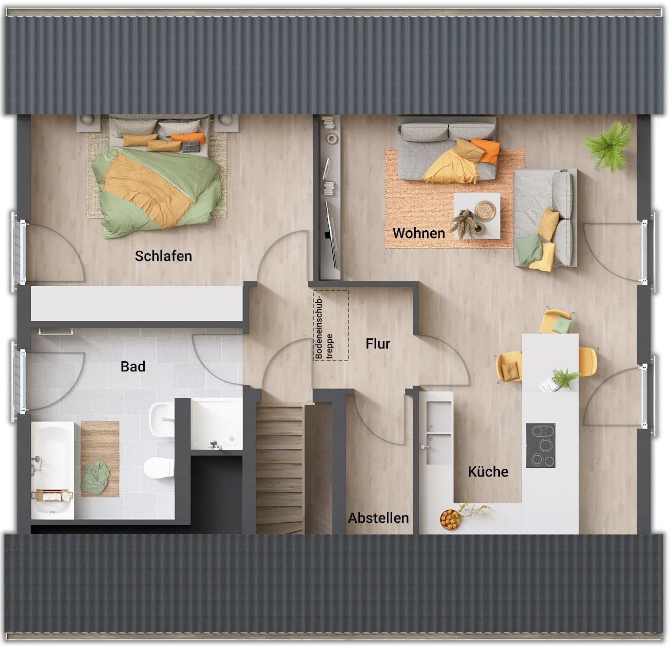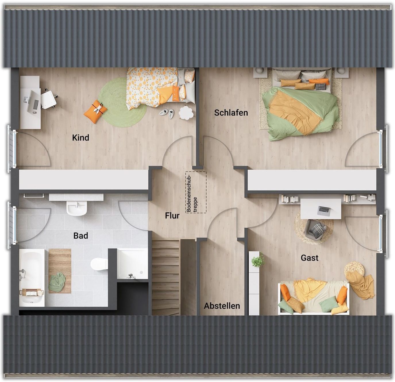 Das Mitwachshaus Flair 148 ist für alle Lebensphasen gut gerüstet – dank Ausbaureserve im Dachgeschoss. Diesen zusätzlichen Platz können Sie bei Bedarf für ein weiteres Kinderzimmer, ein Büro oder eine kleine Einliegerwohnung nutzen.