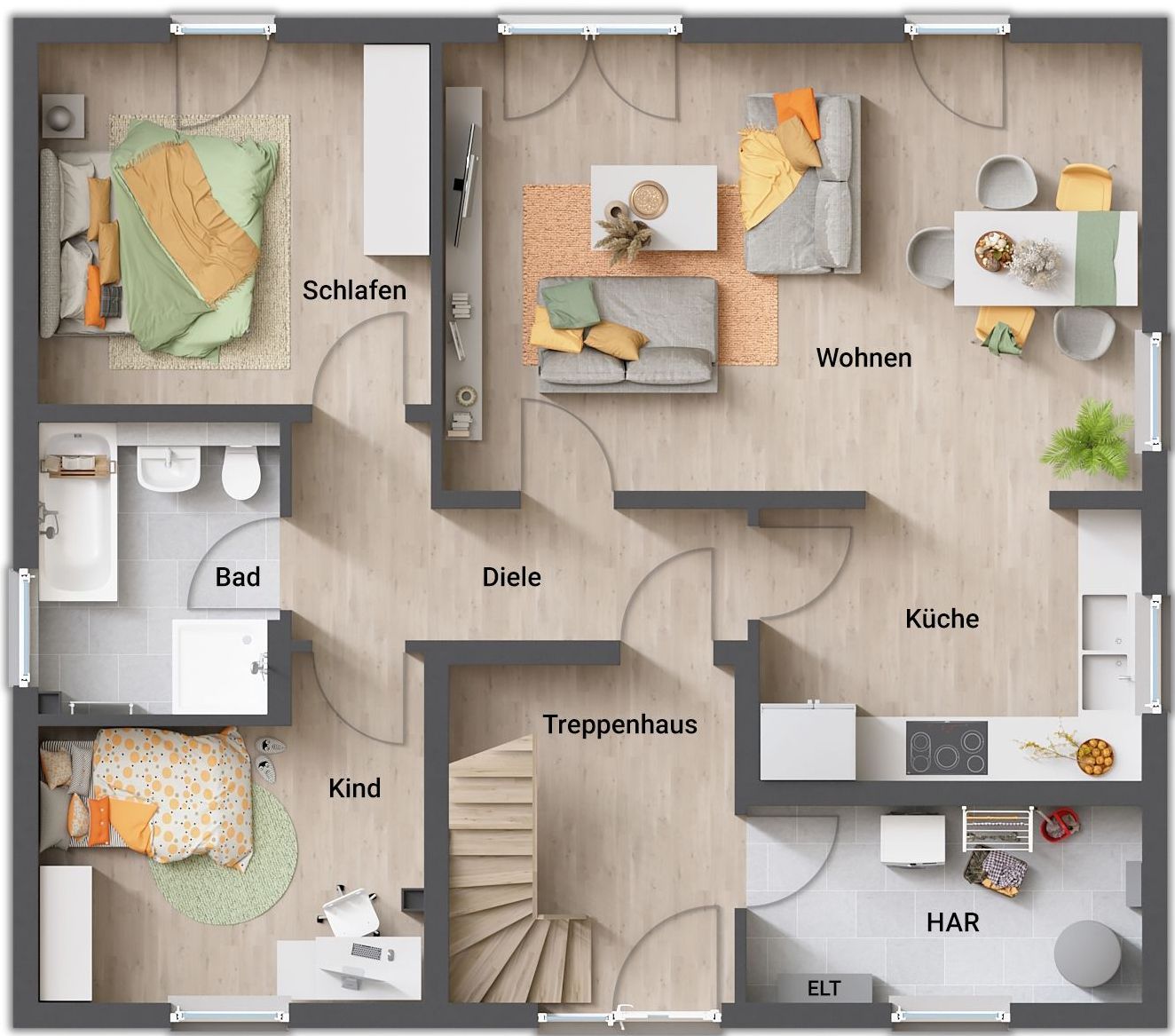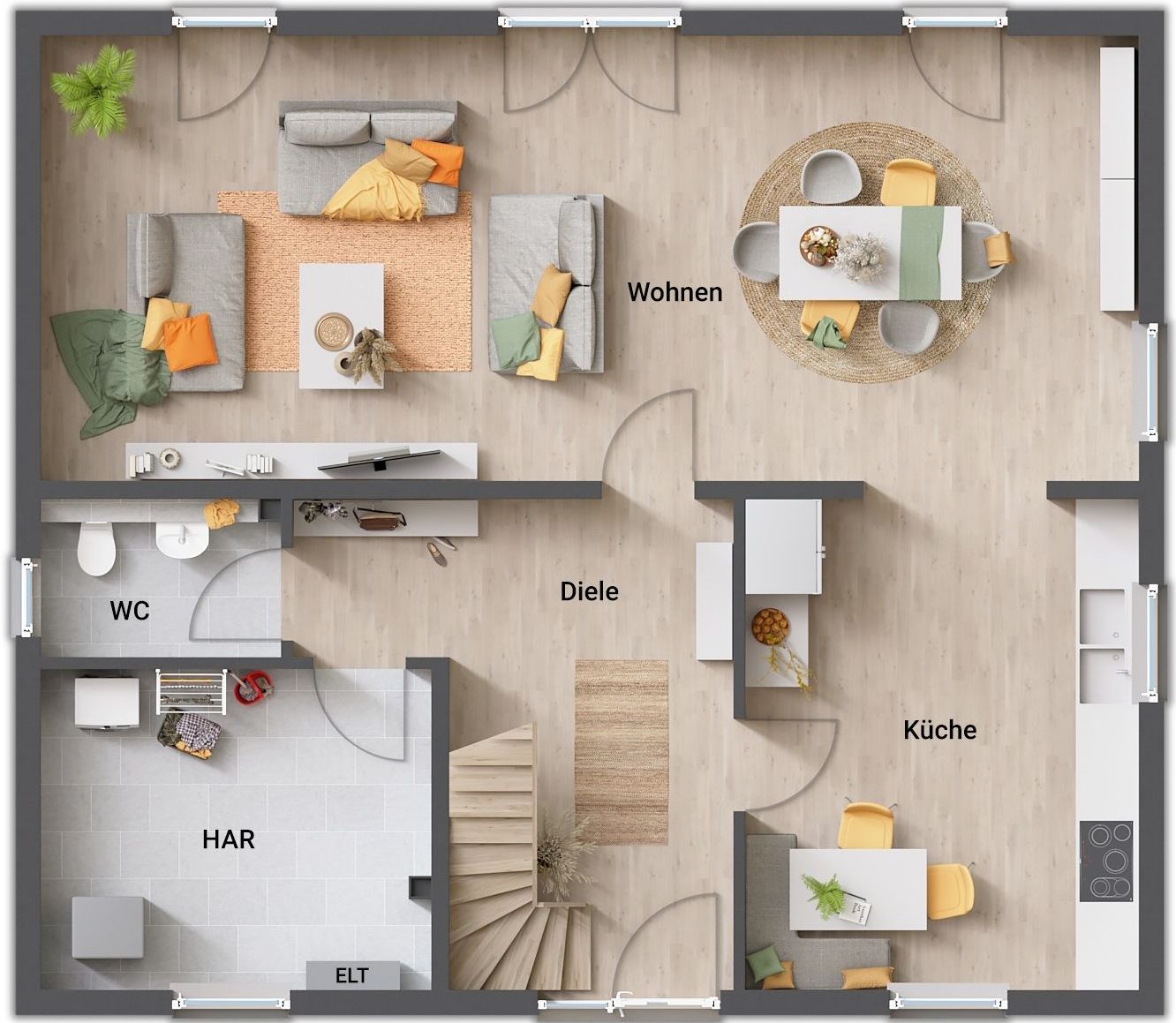 Das Mitwachshaus Flair 148 hat alles, was ein Haus zum Wohlfühlen benötigt: ein gemütliches Wohnzimmer mit hellem Essbereich und großen Fenstern, die viel Tageslicht hinein lassen. Die geräumige Küche bietet nicht nur Platz für das Familienfrühstück unter der Woche.