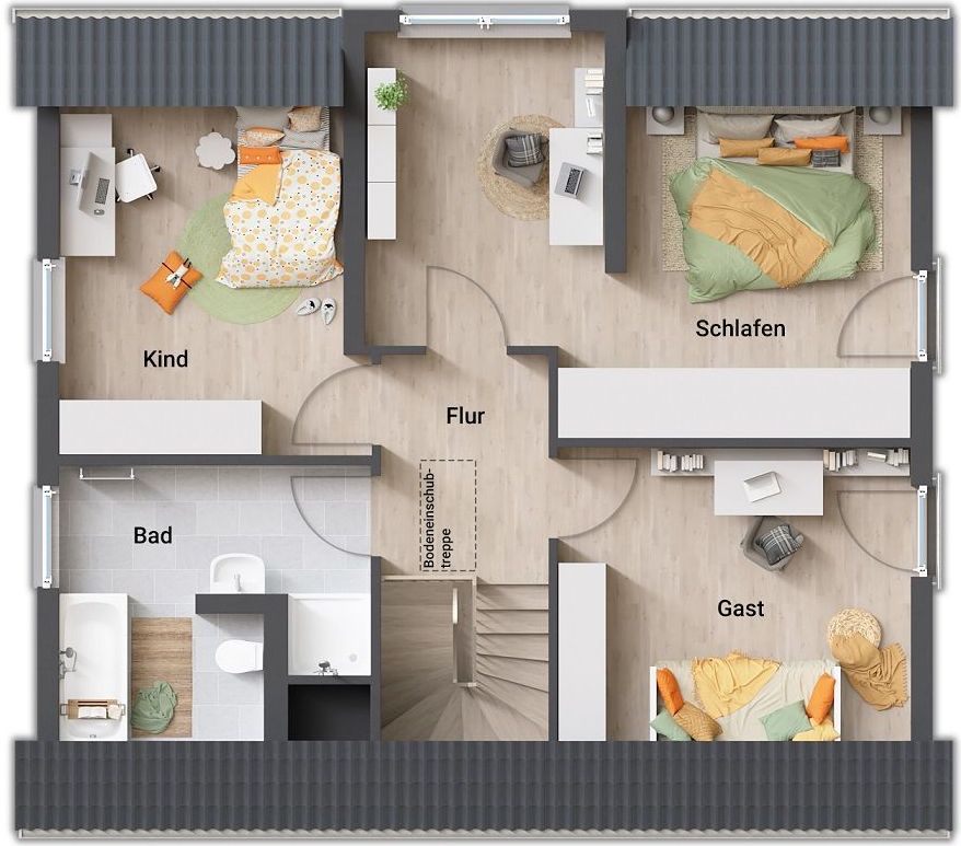 Bewolkte dagen? Niets in de vuurtoren. Hoge raamelementen zorgen voor bijzonder aangenaam daglicht in de hele woning. U kunt uw nieuwe woning inrichten zoals u dat wilt. Of het nu gaat om een modern design of een traditionele bakstenen gevel, dakkapellen of traliewerk. Maak uw droomhuis waar volgens uw ideeën.
