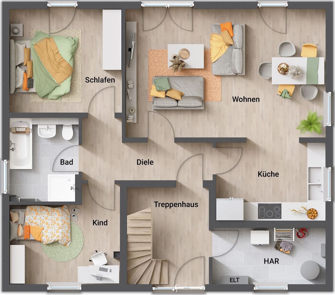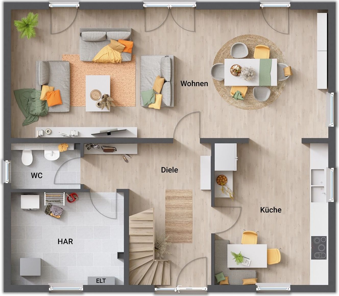 Het meegroeihuis Flair 148 heeft alles wat een huis nodig heeft om zich goed te voelen: een gezellige woonkamer met een lichte eethoek en grote ramen die veel daglicht binnenlaten. De ruime keuken biedt niet alleen doordeweeks ruimte voor een familieontbijt.