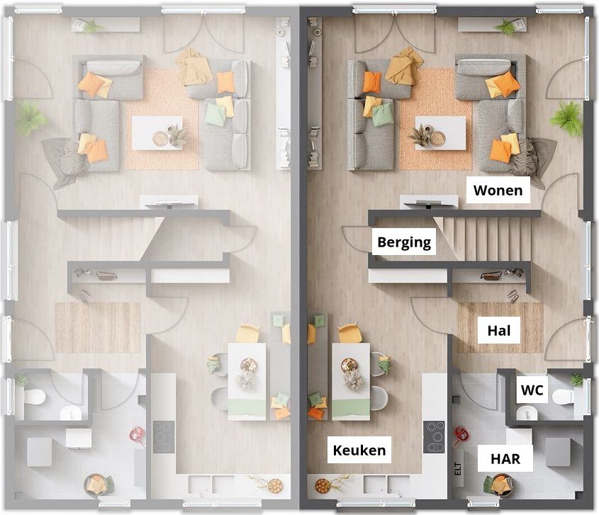 In de ruime keuken/woonkamer is voldoende ruimte om voor het hele gezin te eten. De entree van de woning met garderobe is royaal gepland. Onder de gesloten, enkeltraps trap bevindt zich een berging die optimaal gebruik maakt van de beschikbare ruimte. Ook de kamers op de bovenverdieping hebben kamerhoge ramen die de kamers voorzien van veel daglicht. De dressing in de slaapkamer biedt veel opbergruimte en maakt de droom van een inloopkast waar. In de gang op de bovenverdieping biedt ruimte voor een grote kast, die hier perfect geïntegreerd kan worden.