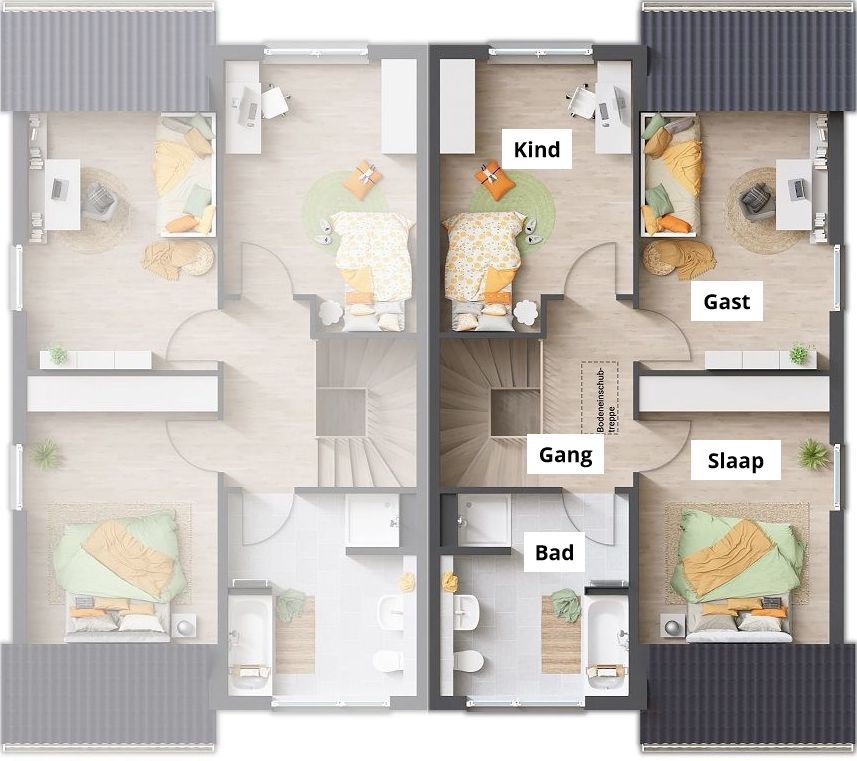 Op de bovenverdieping zorgen de gevels met dakkapellen met plat dak voor meer comfort. Hierdoor wordt de badkamer op de volledige verdieping een echte oase van welzijn en zijn er geen schuine plafonds in de gezellige kinderkamer. Kamerhoge ramen zorgen voor veel licht en helderheid in de gasten- en hoofdslaapkamers.