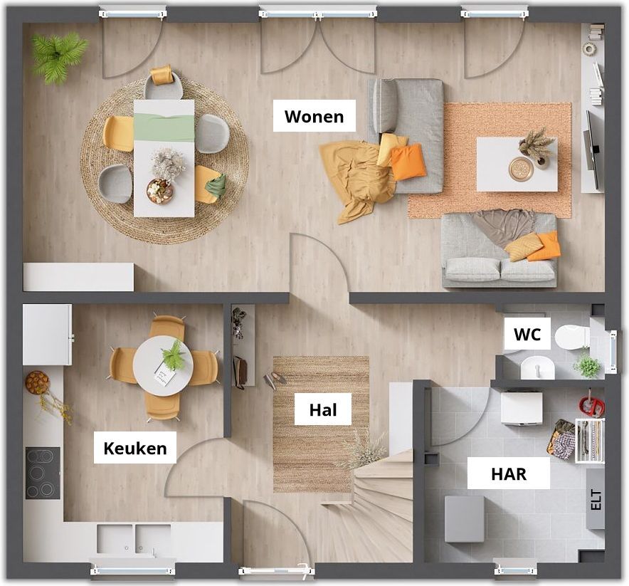 De woonkamer en eetkamer zijn met elkaar verbonden en de ruime keuken wordt al snel een populaire ontmoetingsplek voor gezinnen. Indien nodig, voor bijvoorbeeld een kantoor aan huis, kan er op de begane grond nog een kamer gepland worden. De Flair 110 is royaal ontworpen, zowel in de slaapkamer, kinderkamer en gastenkamer als in de badkamer, en maakt indruk met zijn charme.