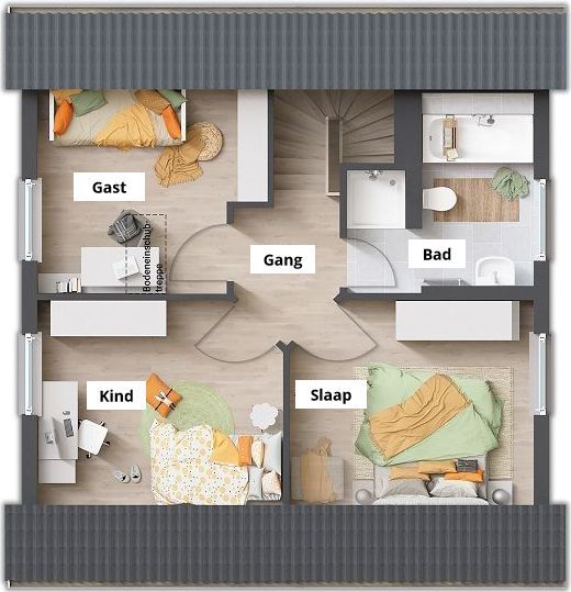 Op de bovenverdieping wachten nog drie kamers op u. Of het nu gaat om een slaapkamer, kinderkamer, logeerkamer of studeerkamer: hier vindt iedereen zijn eigen persoonlijke ruimte. De uitgebalanceerde indeling geeft u voldoende ruimte en zorgt voor ontspannen wonen in een prettige sfeer.