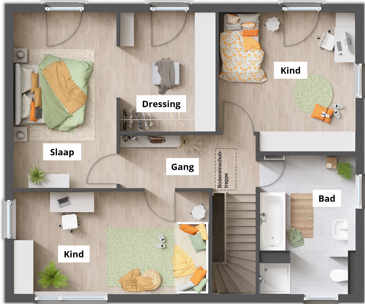 Ook op de bovenverdieping is de rechte bouwstijl van de woning te zien. Hier vindt u drie kamers die u naar eigen wens kunt gebruiken als slaapkamer, kinderkamer of gastenkamer. Grote ramen laten hier bovendien veel daglicht naar binnen stromen. De dressing in de slaapkamer biedt veel opbergruimte.