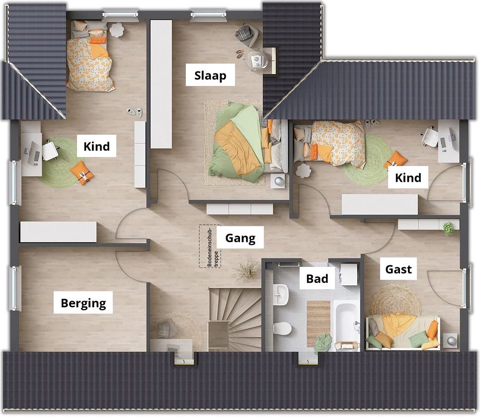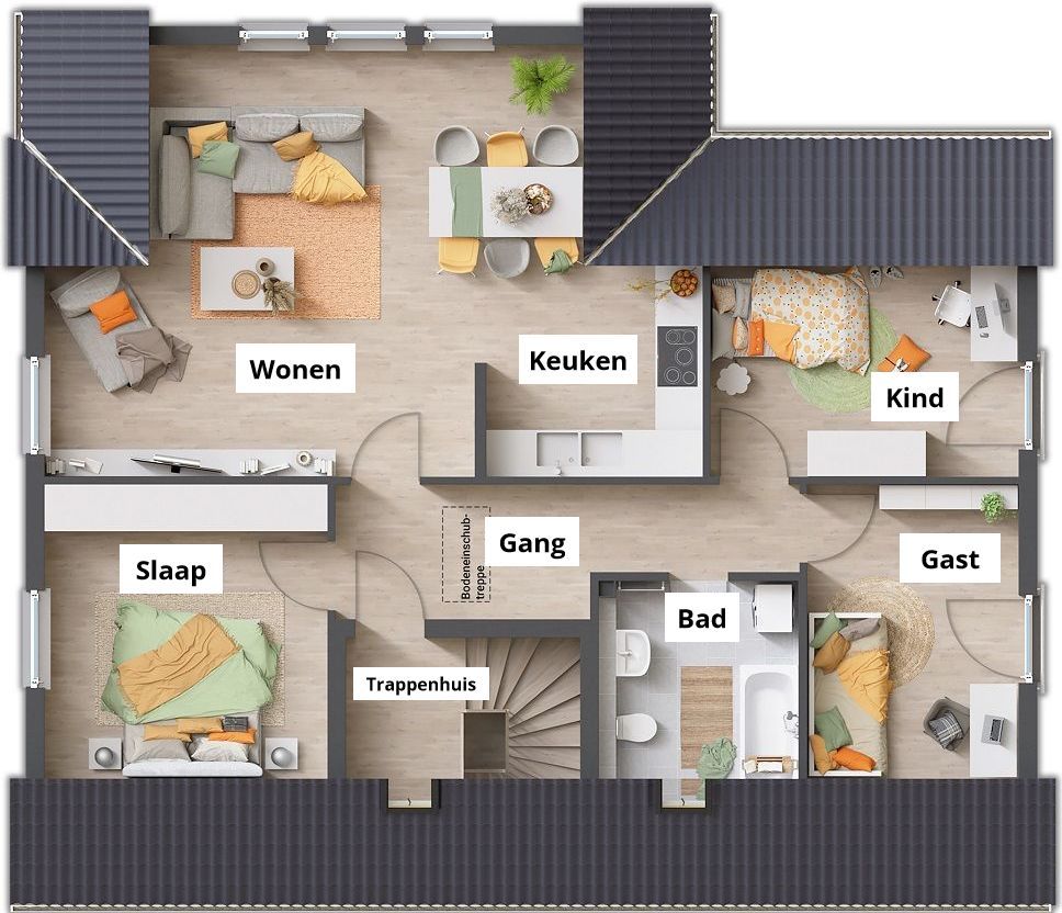 Op de benedenverdieping is er voldoende ruimte voor een grote woon- en slaapkamer, maar ook een kinderkamer en gastenkamer. Vanuit de woonkamer heeft u door de kamerhoge ramen een prachtig uitzicht op uw tuin. Ook vanuit uw slaap- en gastenkamer heeft u hier rechtstreeks toegang toe. Bijzonder sfeervol is de overdekte hoek tussen woonkamer en gastenkamer als je naar buiten gaat.