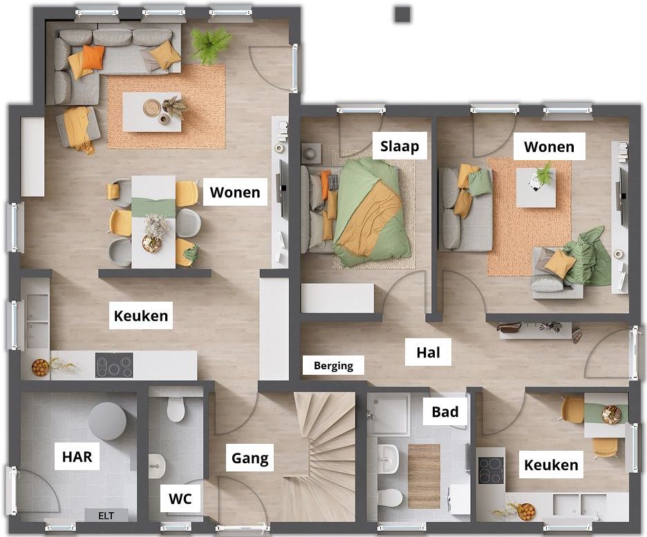 Domicilie 192 is dubbel goed: omdat het op twee verdiepingen ruimte en comfort biedt voor twee gezinnen.