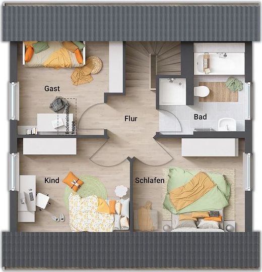 Im Dachgeschoss erwarten Sie drei weitere Zimmer. Ob Schlafzimmer, Kinderzimmer, Gäste- oder Arbeitszimmer – hier findet jeder sein persönliches Reich. Die ausgewogene Planung schenkt Ihnen genügend Platz und sorgt für entspanntes Wohnen in angenehmer Atmosphäre.