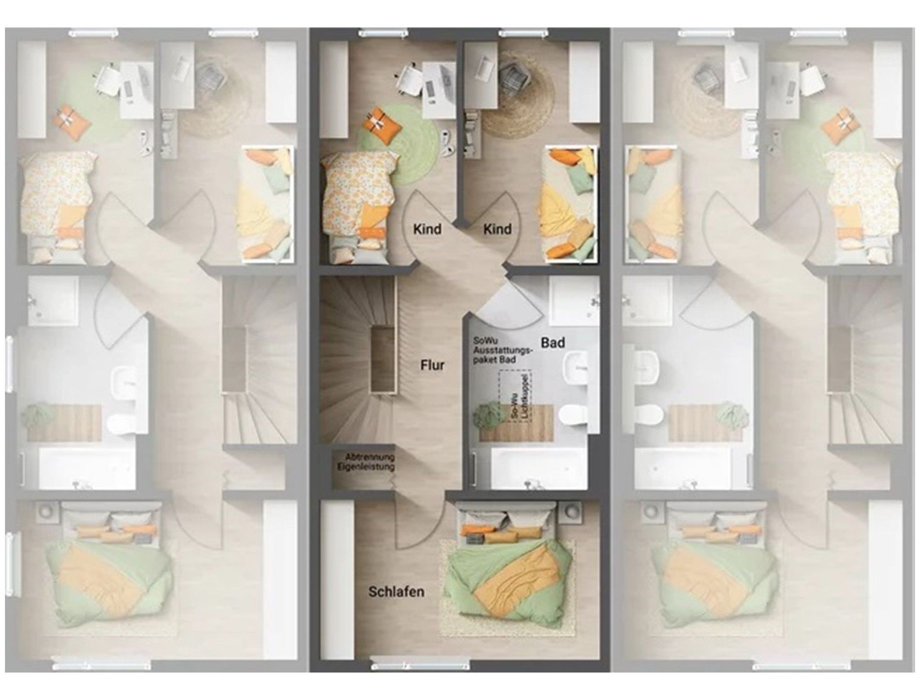 Dank dem flexiblen Grundriss kann das Reihenhaus Ihren Traum vom Eigenheim erfüllen! Im Obergeschoss ist der Rückzugsort für groß und klein. Angefangen bei zwei Kinderzimmern über das großzügige Schlafzimmer bis hin zur Spa-Oase. Werfen Sie einen Blick auf die Grundrisse und verwirklichen Sie Ihr massives Traumhaus.