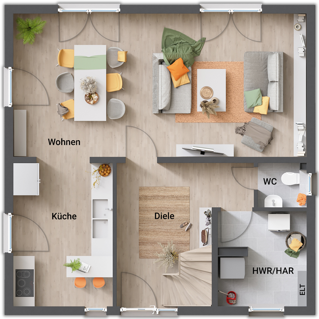 Die kubische Form ist der Klassiker im Stadthausdesign und prägt auch das Aussehen unseres Stadthaus Flair 124. Im Inneren setzt sich der urbane Stil fort: der großzügige Wohn- und Essbereich erstreckt sich über die gesamte Hausbreite und ist das Herzstück des Hauses. Große Fenster lassen viel Tageslicht hinein und führen gleich hinaus zu Ihrem Wohnzimmer im Grünen – der Terrasse.